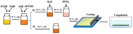 Two kinds of alumina/PVDF flat sheet membranes were fabricated for comparison in subsequent experiments. They were produced via the phase inversion method combined with the sol-gel method. Two bottles of homogenous dope solutions were prepared by the PVDF powder, NMP, under stirring at 70 °C for 24 h. ASB as the alumina precursor and APTMS as an additive were added to both solutions and stirred at 90 °C for 12 h. After that, deionized water was added into one of them (recorded as #2) stirring at 90 °C for 1 h and then nitric acid was added into it stirring at 60 °C for 24 h (PVDF/ASB/APTMS/HNO3/H2O/NMP at 20:2:1:0.069:0.76:89 weight ratio). The other one which was not added with deionized water and nitric acid was recorded as #1 (PVDF/ASB/APTMS/NMP at 20:2:1:89 weight ratio). The final dope solutions were both cooled down and degassed at room temperature and casted into film with a casting knife whose gate height was 400 μm. The casted film was then immersed into water at room temperature immediately to form a membrane. The resultant membranes (Original#1 and Original#2) were stored in a water bath for at least 3 days and dried in air before use. The preparation process was illustrated in Figure 1. Compared with Original#1, H2O and HNO3 were added in the dope solution for Original#2. The introduction of H2O may promote the hydrolysis rate of the precursors while increasing the instability of the dope system. HNO3 was used as a catalyst in the sol-gel process.