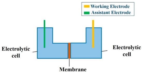 EIS measurements were performed in 0.01 mol/L KCl aqueous solution at room temperature using a CS310H impedance analyzer electrochemical workstation (Corrtest, Wuhan, China) [28]. The schematic of the EIS device is demonstrated in Figure 2. A membrane with an effective area of 1.77 cm2 was fixed between two electrolytic cells. Two platinum electrodes (1 cm2 each) were installed in the two electrolytic cells and maintained at the same interval and depth [37]. The impedance spectra were monitored in the frequency range from 0.1 to 106 Hz. The amplitude of the input sinusoidal voltage was 5 mV. The impedance spectra of the as-prepared membrane substrate and modified membranes were tested in 0.01 mol/L aqueous KCl.
