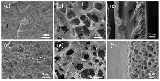 Top view, bottom view, and cross-sectional view of the Original#2 and the modified POMs-M#2 membrane by FESEM: (a–c) for images of the Original#2 and (d–f) for the modified POMs-M#2, respectively.