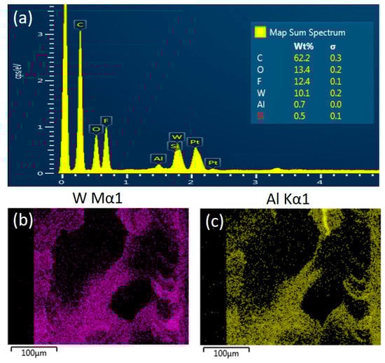 (a) Energy-dispersive X-ray spectroscopy (EDX) spectrum of the modified membranes (POMs-M) with inset of atomic contents of main elements and EDX images of (b) W and (c) Al elements of the cross-section of POMs-M membrane.