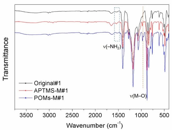 Fourier transform infrared (FTIR) spectra of the original alumina/polyvinylidene fluoride (PVDF) membrane (Orginal#1), the (3-aminopropyl)trimethoxysilane (APTMS)-treated membrane (APTMS-M#1), and the Co mono-substituted Keggin-type [PW11O39Co(H2O)]4− (PWCo)-modified membrane (POMs-M#1).