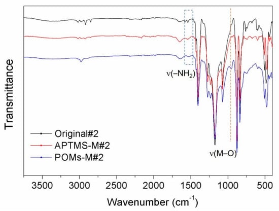 FTIR spectra of the original alumina/PVDF membrane (Orginal#2), the APTMS-treated membrane (APTMS-M#2), and the PWCo-modified membrane (POMs-M#2).