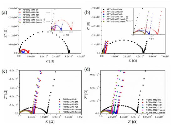 Nyquist plots of EIS analysis in terms of immersion time in 0.01 mol/L KCl solution: (a) APTMS-M#1, (b) APTMS-M#2, (c) POMs-M#1, and (d) POMs-M#2.