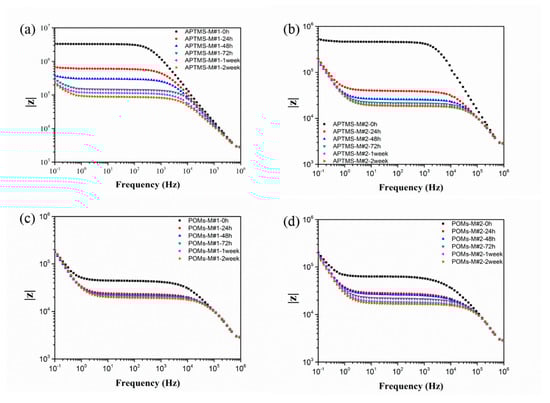 Bode plots of EIS analysis in terms of immersion time in 0.01 mol/L KCl solution: (a) APTMS-M#1, (b) APTMS-M#2, (c) POMs-M#1, and (d) POMs-M#2.