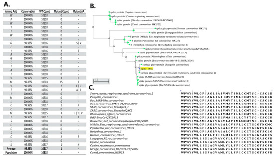 Intra-species conservation and inter-species phylogenetic analyses of the spike transmembrane domain. (A) Conservation score of the spike transmembrane domain (TMD) protein sequence between all submitted sequences for surface glycoprotein in severe acute respiratory syndrome coronavirus 2 (SARS-CoV-2) samples. (B) Phylogenetic tree of the spike TMD sequence between different members of the Betacoronavirus genus. (C) the multiple sequence alignment visualization of the phylogenetic tree sequences.