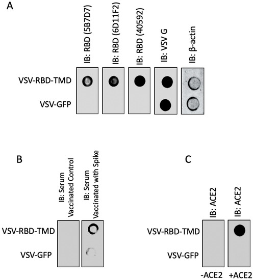 Next, we sought to investigate whether the RBD-TMD trimerized protein complex retains RBD’s antigenic and functional conformation. Therefore, we constructed an attenuated vesicular stomatitis virus (VSV) expressing RBD-TMD to evaluate the conformation of the construct as a potential antigen encoded in a vaccine vector. Dot blot analysis revealed that both neutralizing antibodies targeting conformational epitopes in the RBD (Figure 3A) and mouse sera targeting spike (Figure 3B) recognized the RBD-TMD construct. These data suggest that the RBD-TMD trimer retains the antigenic conformation of the RBD. In addition, we also examined the capacity of RBD-TMD to interact with ACE2 using dot blot analysis (Figure 3C). Our results demonstrate that RBD-TMD binds ACE2—pointing to the fusion protein’s maintained capacity to interact with the SARS-CoV-2 host cell receptor. Collectively, our data demonstrate that the TMD fusion construct mediates trimerization of RBD while maintaining a relevant antigenic conformation for vaccine design.