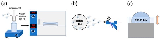 The SP method was applied to attach the composite catalyst to the Nafion N115 membrane. An ink composed of 0.3% photocatalyst, 2.7% of 5% Nafion solution, and 97.0% of isopropanol was prepared and ultrasonicated for 45 min at 37 kHz before being applied to the membrane. The membrane was placed on a heating plate at 60 °C while it was sprayed to achieve a photocatalyst concentration of 10% w/w on the membrane. After spraying, the membrane was dried for 24 h at ambient conditions.