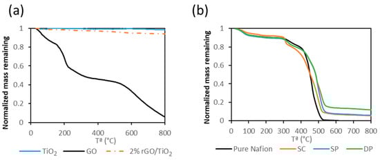 TGA of TiO2, pure GO and rGO/TiO2 (a). TGA of pure Nafion and photocatalytic membranes (b).