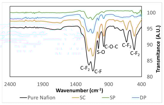 Figure 3 shows FTIR spectra of pure Nafion and photocatalytic membranes. The pure Nafion curve showed the typical bands of this material. The bands at 1200 and 1140 cm−1 were assigned to the stretching vibrations from C–F2 and C–F, respectively. The 1056 and 975 cm−1 bands were attributed to S–O stretching vibrations and C–O–C stretching vibrations, respectively. The bands at 627 and 512 cm−1 were assigned to C–F2 bending vibrations. Photocatalytic membrane spectra showed the typical bands of Nafion suggesting that the addition of photocatalyst does not affect the molecular structure of the Nafion membrane. This fact was also observed by Ding et al. [45]. However, the intensity of these bands was different for the different membranes. Pure Nafion showed the highest band intensity followed by the SC membrane in which most of the photocatalyst is contained inside the membrane matrix. SP and DP membranes showed less intensity in the FTIR spectra because the photocatalyst remains on the surface of the Nafion membranes. The slightly smaller thickness of the photocatalyst layer (9.8 and 12.6 µm in DP and SP membranes, respectively) of DP membranes that was revealed in cross section SEM images (Figure 4) could explain the higher FTIR signal intensity in the DP compared to the SP membrane.