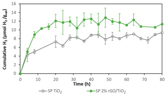 In order to confirm the higher photocatalytic activity of the composite photocatalyst compared with bare TiO2 when they are immobilized on Nafion membranes, SP and TiO2 immobilized catalysts were tested for photocatalytic hydrogen production (Figure 5). Although the initial rate of hydrogen production with both photocatalysts was similar (ca. 1.1 µmol H2 gcat−1 h−1), the initial rate using TiO2 decreased after 4 h and reached a total hydrogen production of 9 µmol H2 gcat−1 while the composite decreased its initial rate after 8 h with a total hydrogen production of 12 µmol H2 gcat−1. It was confirmed that 2% rGO/TiO2 photocatalytic membranes performed better than TiO2 membranes for hydrogen production.