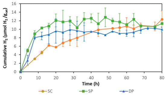Membranes obtained following the three different photocatalyst immobilization methods were tested for hydrogen production (Figure 6). Composite SP and DP membranes achieved HPRs of 1.11 ± 0.09 and 1.01 ± 0.10 µmol H2 gcatalyst−1 h−1, respectively. With these membranes, hydrogen production was stopped after around 20 h. The composite SC membrane achieved an initial rate of 0.38 ± 0.03 µmol H2 gcatalyst−1 h−1 during the first 8 h, but the hydrogen production continued to increase smoothly and stopped around 60 h of photoreaction. The higher initial activity of SP and DP membranes was attributed to the higher accessibility to the photocatalyst provided by these membranes, as the catalyst was mainly deposited on the membrane surface while SC membranes had most of the photocatalyst embedded in the membrane matrix, thus, exerting higher resistance to mass transport of the sacrificial agent.