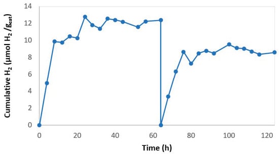 In order to evaluate the reuse of the SP membrane several cycles of hydrogen production were carried out. After each cycle, the system was purged with argon to prevent the inhibitory effect of the accumulated hydrogen (Figure 7). It was observed that at the end of the first cycle hydrogen production had stopped and after an argon purge, hydrogen production continued. This fact supports the inhibitory effect of the reaction product on the HPR, as was expected. The initial rate in the reuse cycles was 0.79 µmol H2 gcatalyst−1 h−1 while with the fresh membrane it was 1.19 µmol H2 gcatalyst−1 h−1. Therefore, the membrane photoactivity had been reduced by 33%. Ma et al. evaluated the re-use of Er3+:YAlO3Pt-TiO2 on a glass substrate [32]. They carried out 5 cycles of 5 h. The loss of photocatalyst activity after 25 h was 80%, while in this work the loss of activity after 64 h of operation was quantified as 33%.