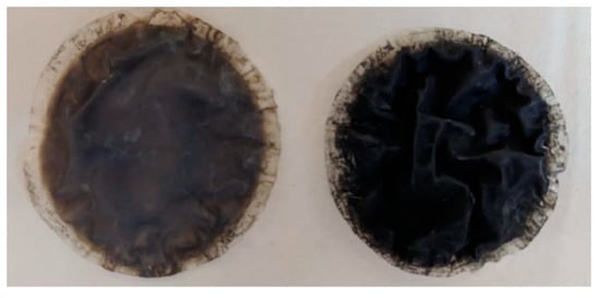 Darkening was observed in the used membranes in comparison with the pristine photocatalytic membranes (Figure 8). This darkening could be attributed to the further reduction of graphene. The reduction of graphene during photocatalytic experiments has been previously reported. Shah et al. observed darkening after reduction of graphene oxide [56]. In our previous study, darkening of TiO2/rGO composites was observed after being used in photocatalytic hydrogen production in slurry photoreactors, the reduction of the composite being confirmed through Raman spectra [55]. A decrease in the photoactivity after the first hydrogen production cycle was also observed.