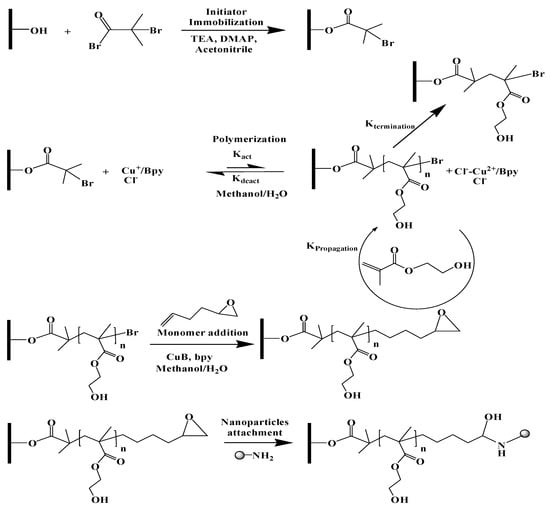 All reagents were ACS grade or higher, unless specified. Methanol, glycerol and acetonitrile were purchased from MilliporeSigma (Billerica, MA, USA). Triethylamine (TEA); 4-dimethylaminopyridine (DMAP); N,N,N′,N″,N″-pentamethyl diethylenetriamine (PMDETA, 99%); sodium phosphate monobasic (99%); sodium phosphate dibasic (99%) copper (I) chloride; copper (II) chloride and copper(I) bromide (CuCl, CuCl2 and CuBr 99.999% trace metal basis) were purchased from Sigma-Aldrich (Munich, Germany). α-Bromoisobutyryl bromide (BIB, 98%) was purchased from Alfa-Aesar (Ward Hill, MA, USA). 1,2-epoxy-5-hexene and 2-hydroxyethylmethacrylate (HEMA, >97%, stabilized) was purchased from Acros Organic (98%, Pittsburgh, PA, USA). Bovine serum albumin (BSA, biotechnology grade) and L-(+)-ascorbic acid (AA) were purchased from Amresco (Solon, OH, USA). 2,2′-Bipyridine (Bpy) was purchased from BeanTown Chemical (Hudson, NH, USA). Iron oxide superparamagnetic nanoparticles with a 15-nm core diameter and a 5-nm coating layer functionalized with amine groups were purchased from Ocean Nanotech (San Diego, CA, USA). All water used in this work was obtained from a Thermo Fisher 18 MΩ Barnstead Smart2Pure System (Schwerte, Germany). Commercially available regenerated cellulose membranes with a nominal molecular weight cutoff of 100 kDa were purchased from MilliporeSigma (product codes: PLCHK and PCLMK).