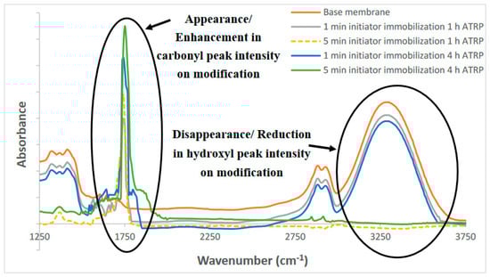 Figure 2. Attenuated total reflectance Fourier-transform infrared (ATR-FTIR) spectra for the base and modified membranes. ATRP: atom transfer radical polymerization.