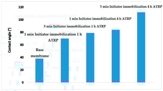 Figure 3. Water contact angles (°) for the base and modified membranes (error within ±5°).