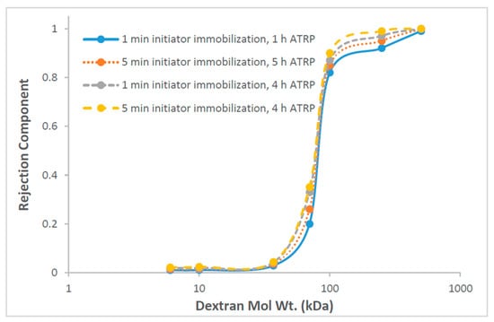 Figure 5. Dextran rejection as function of molecular weight for membranes modified under different conditions.