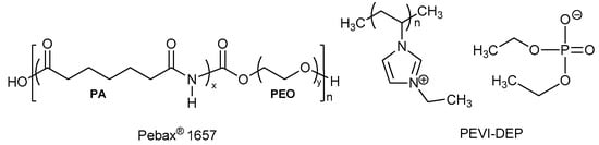 Structures of Pebax® 1657 and PEVI-DEP (PA = polyamide, PEO = polyethylene oxide).
