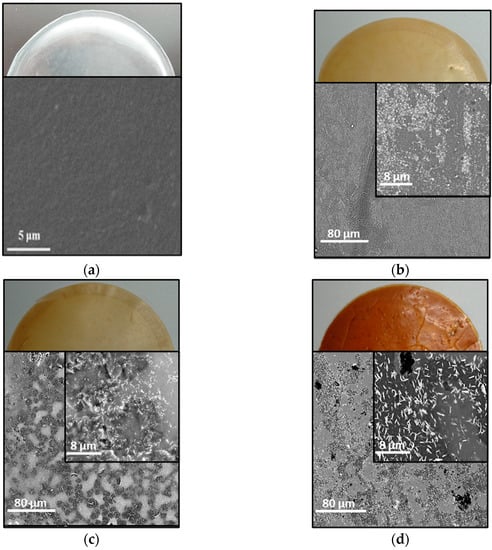 Photographs and SEM images of samples containing (a) 0 wt.%, (b) 20 wt.%, (c) 40 wt.%, and (d) 60 wt.% of PEVI-DEP in Pebax® 1657. SEM images in (b–d) were acquired at magnifications of 1000× and 10,000×. The SEM image in (a) was adapted from Peng et al. [49].