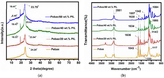 XRD patterns of the membranes with different amounts of PEVI-DEP are shown in Figure 3a. The semicrystalline character of Pebax® 1657 is demonstrated by a broad amorphous halo (12.5–22.6°) and a dominant peak around 24° (2θ) representing the crystalline segments of the PA domains. The presence of PEVI-DEP in the Pebax® 1657 matrix caused a shift in the PA peak and a corresponding increase in the d-spacing from 24.29° and 3.664 Å for neat Pebax® 1657, to 23.79° and 3.739 Å for the Pebax® 1657/60 wt.% PEVI-DEP sample, confirming our previous hypothesis. This shift can be attributed to the intercalation of the charges of the cations in the PIL to influence the Pebax® 1657 polymer chain backbone [50] and is in agreement with earlier observations that low-molar-mass [BMIM][CF3SO3] interferes with the crystalline phase of Pebax® 1657 [35]. Simultaneously, it indicates that the addition of PIL did not affect the inter-chain hydrogen bonding between PA segments in Pebax, since the hindering of their formation generally leads to the growth of the amorphous region [51]. Furthermore, the Pebax® 1657/PEVI-DEP membranes spectra contain another peak at 19.23° originating from the presence of crystalline ionic liquid-like domains.