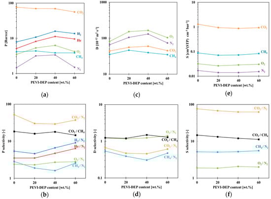 Figure 4 and Appendix A (Table A1) demonstrate the gas transport parameters of Pebax® 1657/PEVI-DEP composite membranes. Overall, the trends of gas permeability and diffusivity exhibit a rise with increasing PEVI-DEP content (Figure 4a,c). More specifically, the permeabilities reach maximum values for all gases in the membrane prepared with 40 wt.% of PEVI-DEP. However, CO2 and CH4 deviate from this trend, as their permeability remains almost constant or slightly decreases with increasing PEVI-DEP content. The transport reflects a combination of the effects of PEVI-DEP on the morphology and microstructure of the membranes and the effect on the individual phases. The weak increase in permeability for the smaller gases, together with a slight increase in size-selectivity, is due to a combination of effects caused by the addition of PEVI-DEP: reduced crystallinity of samples and an increase of their amorphous fraction leading to an increase of the overall permeability, since the crystalline phase is impermeable.