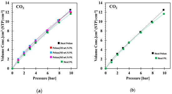 Sorption isotherms in Figure 5a,b show that all samples adsorbed CO2 in a slightly nonlinear fashion, which can be described satisfactorily by the dual-mode sorption model (Equation (4)). The sorption of CH4 and N2 was too close to the lower detection limit and could not be determined with sufficient accuracy. Therefore, the sorption isotherms of CH4 and N2 are not reported. The low CH4 and N2 uptakes in Pebax® 1657/PEVI-DEP composites align well with other literature reports. The gas sorption follows the decreasing trend N2 ≤ CH4 << CO2 as reported for a series of poly(diallyldimethylammonium) (P[DADMA])-based PILs [52]. While the PIL concentration in the Pebax® 1657/PEVI-DEP membranes has a relatively mild effect on the CO2 sorption capacity, the change in the isotherm shape is clearly distinguishable. Figure 5b compares sorption behavior of neat Pebax® 1657 and neat PEVI-DEP. While the CO2 sorption isotherm of neat Pebax® 1657 increases almost linearly with pressure, with a dominant role of Henry’s law, the sorption isotherm of neat PEVI-DEP exhibits concave shape attributed to dual-mode sorption. Dual-mode-like features are, therefore, transferred to Pebax® 1657/PEVI-DEP composite membranes as well. The CO2 sorption isotherms (and data reported in Appendix A (Table A2)) confirm the earlier observation that the gas solubility is nearly independent of the PEVI-DEP content, especially at low concentration, similar to that of the permeability measurements.