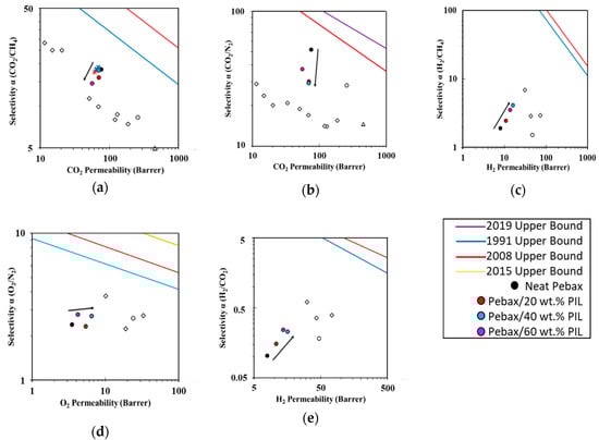 Robeson plots summarize the performance of Pebax® 1657/PEVI-DEP composite membranes and put them in perspective for several industrial gas separation processes (i.e., CO2/CH4, CO2/N2, H2/CH4, O2/N2, and H2/CO2) (Figure 6). With increasing amounts of PEVI-DEP, the selectivity towards CO2 decreases, and the selectivity towards light gases increases. Previous reports demonstrate remarkable improvements of CO2 separation performance in Pebax® 1657 thanks to the addition of ILs [33,34,35]; however, a drop of selectivity was observed for CO2/CH4 and CO2/N2 separations (Figure 6a,b) in Pebax® 1657/PEVI-DEP composites. Therefore, the combination of the two materials did not meet the expectation of improving CO2 separation processes. In particular, the performances of the membrane containing 60 wt.% of PEVI-DEP were fully controlled by the PIL and were very similar to those of other PIL and PIL/IL based membranes [5,22,53,54,55,56]. However, especially in CO2/N2 separation, Pebax® 1657/60 wt.% PEVI-DEP composite membrane is more selective than other PIL and PIL/IL membranes. These pieces of evidence indicate that CO2/CH4 and CO2/N2 separations are mostly favored by the presence of Pebax® 1657. By contrast, H2/CH4 separation (Figure 6c) benefited from the addition of PEVI-DEP, showing an increase of selectivity and H2 permeability, which take Pebax® 1657/PEVI-DEP samples closer to the performance of recently reported phosphonium-based PILs [55]. For H2/CO2 separation (Figure 6e) a trend that moves towards an inversion of selectivity was observed. This is due to simultaneous loss and gain of permeability for CO2 and H2, respectively. Moreover, the addition of PEVI-DEP substantially improved O2 and N2 permeabilities (for PEVI-DEP contents up to 40 wt.%), with a small gain in O2/N2 selectivity as well (Figure 6d). A common feature observed for O2/N2, H2/CH4 and H2/CO2 separations is a decrease of selectivity detected in the membrane prepared with 60 wt.% PEVI-DEP, compared to samples prepared with 40 wt.% and 20 wt.% of PIL. However, despite the modest increase in selectivity and permeability for some gas pairs, Pebax® 1657/PEVI-DEP membranes are still rather far from recent Upper Bound limits [57,58].