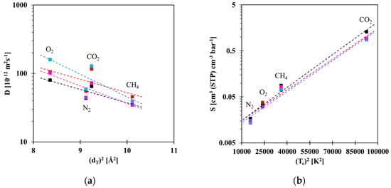 Correlations of (a) diffusion coefficient with Teplyakov’s diameters [60] and (b) solubility with critical temperatures of gas molecules. Linear trends are represented with dashed lines serve as a guide to the eye only.
