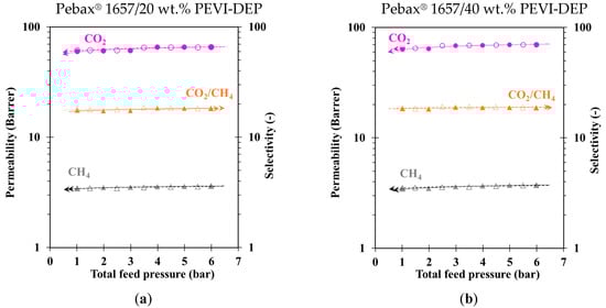 Mixed gas permeation measurements were carried out across a total pressure range of 1–6 bar using a 35/65 vol.% of CO2/CH4 mixture for the two representative samples, namely Pebax® 1657/20 wt.% PEVI-DEP and Pebax® 1657/40 wt.% PEVI-DEP. Both membranes show very similar transport properties to those measured with pure gases in the time-lag setup (Figure 6a). The feed pressure barely affects the transport parameters, which are constant over the investigated range for both membrane compositions (Figure 8). This allows stable performance during industrial operations with variable pressure and composition, such as the biogas upgrading.