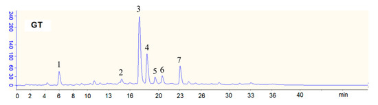 HPLC chromatograms of green tea (GT) beverage. Peaks: 1, gallic acid (GA); 2, epigallocatechin (EGC); 3, caffeine; 4, epigallocatechin gallate (EGCG); 5, epicatechin (EC); 6, gallocatechin gallate (GCG); 7, epicatechin gallate (ECG).