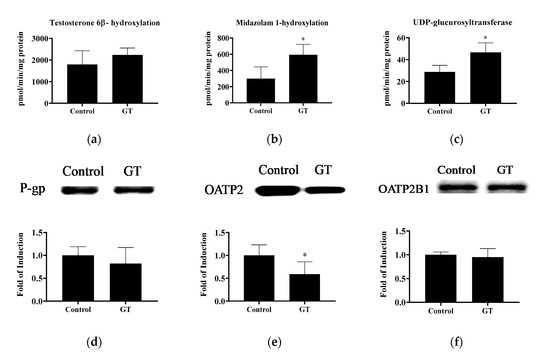 The activities of testosterone 6β-hydroxylation (CYP3A) (a), midazolam 1-hydroxylation (CYP3A) (b), and UDP-glucuronosyltransferase (c) and protein expression of P-gp (d), OATP2 (e) and OATP2B1 (f) in the liver. The analytical methods are described in Materials and Methods. The values are given as the mean ± SD (n = 6). * Significantly different from the control group, p < 0.05.
