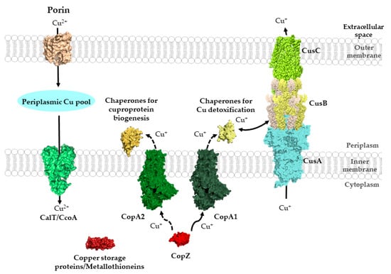 Approximately 30% of all proteins in bacteria depend on metals for their function. Understanding how these potentially toxic metals are imported into bacterial cells and how they are ultimately delivered to their target proteins without inducing toxic effects is a crucial issue in metalloprotein biogenesis (Figure 1) [,]. In contrast to most other nutrients, the concentration of many metals in natural environments usually exceeds cellular needs and hence multiple mechanisms that prevent metal-induced damage are encountered in bacteria. Copper (Cu) is one such metal that is essential in eukaryotes and prokaryotes but is highly toxic when present in excess. Indeed, Cu alloys are used for controlling bacterial surface contaminations []. Furthermore, human macrophages pump copper into their phagosomes after engulfing pathogenic bacteria to induce oxidative stress and bacterial cell death []. Consequently, bacteria have to deal with high copper concentrations in order to evade the host immune system [,,,]. The importance of Cu detoxifying systems for bacterial virulence is exemplified by the observation that the inactivation of Cu-exporting P1B-type ATPases in Mycobacterium tuberculosis impairs their ability to proliferate in host macrophages [,]. The link between Cu homeostasis and bacterial virulence is summarized in several recent reviews and not covered in depth here [,,,,,,].