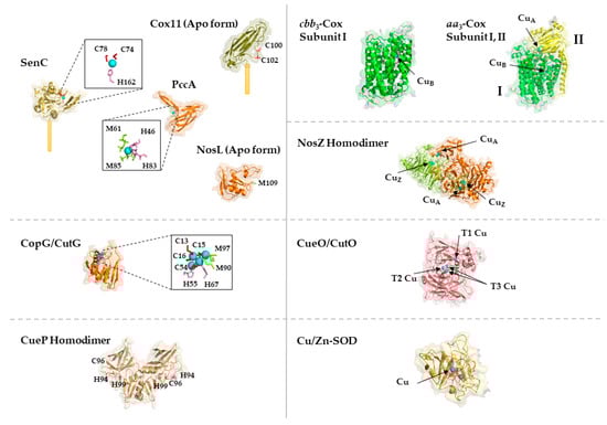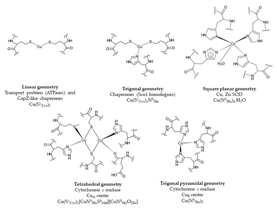 Cu binding sites within proteins are usually composed of cysteine, methionine, histidine and occasionally tryptophane residues []. The composition and geometry of the Cu binding motif is important for its reduction potential. While redox cycling is required for the catalytic activity of cuproenzymes, cuproproteins involved in Cu trafficking need to avoid Cu(I)/Cu(II) redox cycling and therefore their Cu binding motifs require a more negative reduction potential that stabilizes the Cu(I) state [] (Figure 2). Copper trafficking proteins coordinate Cu(I) via a CxC or CxxC motif with a linear geometry as in Cu(I)-transporting P1B-type ATPases or in CopZ-like Cu chaperones [], or with a trigonal planar geometry as in Sco1-like chaperones. Here, two cysteine residues and a distal histidine residue provide the binding site for Cu(I). In cuproenzymes, such as Cu,Zn superoxide dismutase (SOD) or cytochrome oxidase, Cu is coordinated by histidine, cysteine and methionine residues (Figure 2). Cu(II) is preferentially liganded via histidine nitrogen donors in a square planar arrangement [,,]. Methionine as ligand is less pH sensitive and more hydrophobic and provides often an additional weaker ligand for Cu [].