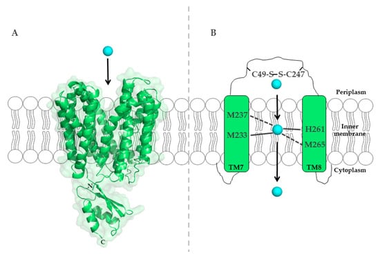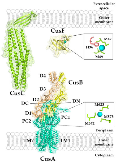 - Long, F.; Su, C.C.; Zimmermann, M.T.; Boyken, S.E.; Rajashankar, K.R.; Jernigan, R.L.; Yu, E.W. Crystal structures of the CusA efflux pump suggest methionine-mediated metal transport. Nature 2010, 467, 484–488. [Google Scholar] [CrossRef]