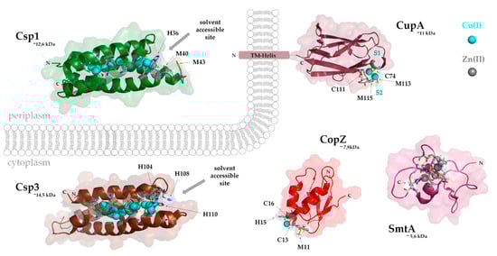 Once Cu has crossed the outer membranes into the periplasm, it is likely scavenged by periplasmic Cu chaperones, Cu-storage proteins and chemical chelators, such as glutathione [,,]. Although several periplasmic Cu chaperones have been described in multiple bacteria, they are mainly associated with Cu-detoxification and cuproenzyme biogenesis pathways [,,]. Hence, it is currently not clear, whether they also participate in Cu uptake, and therefore these proteins are described later. Dedicated Cu-storage proteins (Csps) were first described in the Gram-negative methanotrophic bacteria, but are widely distributed in bacteria []. Csp1-type proteins contain a Tat signal sequence and are likely exported into the periplasm for Cu binding [,,]. As cytosolic Csp3-type proteins are much more abundant than the secreted Csp1-type proteins [], they are further discussed in Section 4.4.