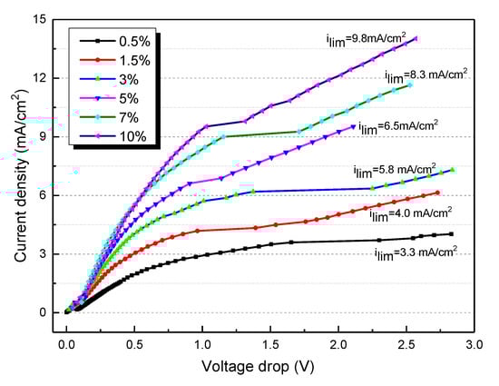 where F is Faraday constant; D is the diffusion coefficient of salt in the solution; C is the salt concentration in the dilute compartment; and t are the transport numbers of counterions in the membrane and the solution, respectively; δ is the thickness of the boundary layer. It is clearly shown that for the ED experiment, the LCD is not a constant value. The value of LCD decreases with the desalting of salts. To simulate the whole desalination process of tobacco extracts, the I-V curves of different contents of tobacco extract in the range of 0.5–10% are determined and depicted in Figure 2. It is clearly shown that the LCD decreases with a decrease in tobacco extract concentration. For instance, the LCD is 9.8 mA/cm2 when the feed tobacco content is 10%, while the LCD decreases to 3.3 mA/cm2 when the feed tobacco content is reduced to 0.5%. The concentration polarization is a common reason for the fouling of the ion exchange membrane.