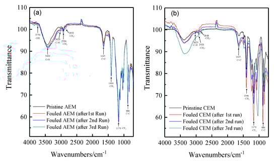 The FT-IR (ATR) spectra of the pristine and fouled anion and cation exchange membranes. (a) anion exchange membrane; (b) cation exchange membrane.