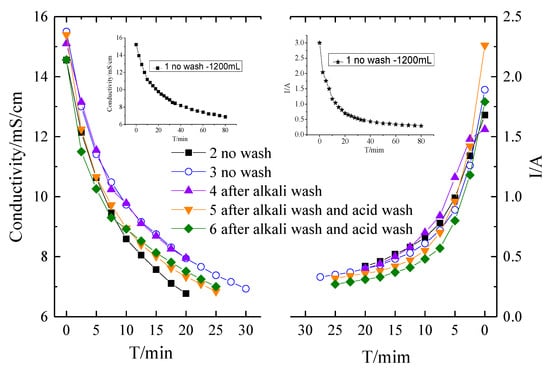 To further mitigate the fouling of the membranes, two kinds of washing were conducted. One is an alkaline wash with 0.1 M NaOH for 15 min, the other one is an acid wash with 0.1 M HCl for 10 min. Acid and base washing is the most common methods for membrane cleaning strategies [4,33,45]. Figure 5 shows the conductivity and current evolution curves of the desalination process with different membrane washing strategies. It should be noticed that the membrane fouling experiments were finalized with 1200 mL solutions for the first batch run and then 400 mL solution for the other batch runs. It can be seen that without washing, the experimental time for a batch experiment in Run 3 is extended compared with that in Run 2, indicating the fouling of the membranes. Due to the fact that most organic matters have good solubility in alkaline circumstances, alkaline washing was conducted at first. However, only alkaline washing has a marginal impact on the mitigation of membrane fouling. As shown in Figure 5, the current of ED with only alkaline washing is even lower compared to that without any washing. Therefore, a combination of alkaline and acid washing was performed. It can be seen that with alkaline and acid washing, the membrane fouling was substantially mitigated. The experiment period was decreased for alkaline and acid washing mode compared to the no washing mode. The current evolution curve in Figure 6 indicated that the current increases in the alkaline and acid washing mode compared to no wash or alkaline washing mode. However, comparing Runs 5 and 6, it can be seen that even though the membrane fouling is mitigated with alkaline and acid washing, the fouling was still aggravated. The chemical washing can only mitigate but cannot avoid the fouling.