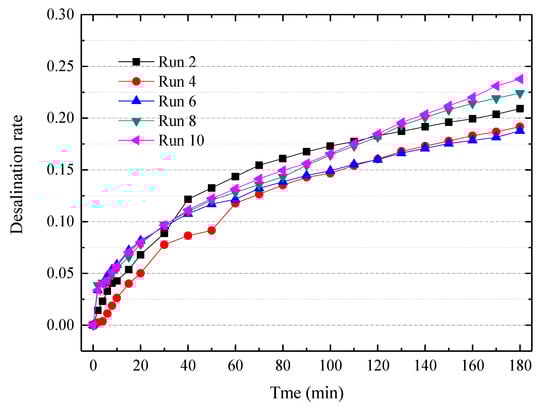 To further mitigate the membrane fouling, we developed a special cleaning agent based on the typical composition of tobacco extract. The composition of the cleaning agent is listed in Table 3. The cleaning agent is diluted to a 2 wt% concentration prior to practical use. Figure 6 indicates the desalination rate curves for ten consecutive ED experiments via this special cleaning agent. The special agent is applied after each batch experiment of ED. The desalination performances were slightly declined during the consecutive experiments, but the desalination rates became stable after the 6th experiment. The membrane fouling can be divided into reversible fouling and irreversible fouling. The reversible fouling can be recovered by chemical cleaning, but the irreversible fouling cannot be recovered. Nevertheless, this special cleaning agent containing a surfactant and metal-chelator is very effective for treating the tobacco extract. To increase the viability of electrodialytic desalting of tobacco extract, an elaborate pretreatment [27] and other mitigation strategies such as reversal ED or pulsed electric field [46,47,48,49] need to be further developed.