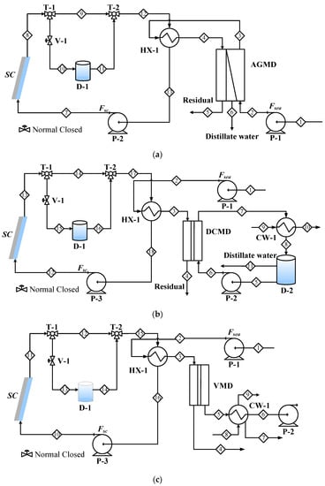 Process flow diagrams of solar-driven (a) AGMD, (b) DCMD, (c) VMD systems for desalination.