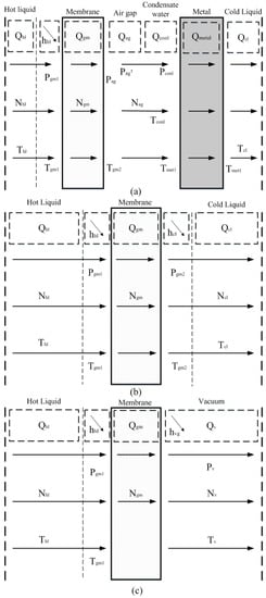 The AGMD module consists of hot and cold seawater flow channels, a membrane layer, an air gap layer, and a metal layer. The DCMD module consists of a hot seawater channel, a cold water flow channels, and a membrane layer. The VMD module consists of a hot seawater flow channel, a membrane layer, and a vacuum layer. The detailed drawing of each module and variable notations are shown in Figure 2a–c. The model assumptions of these modules are: (1) The vaporization of water occurs at the interface between the hot fluid and the membrane. (2) The heat and mass transfer across the interfaces can be described using film theory with correlations of heat and mass transfer coefficients. (3) Only water vapor can transfer through the membrane pores. (4) The membrane module operation is adiabatic.
