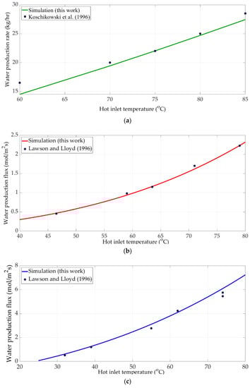 The experimental data of AGMD, DCMD, and VMD modules taken from Koschikowski et al. [] and Lawson and Lloyd [,] were used to verify the membrane distillation models. The properties and materials of the membranes are shown in Table 2. For the DCMD module, membrane with smaller pore size might be needed to prevent operation problems. The smaller pore size gives lower water flux and hence requires higher membrane area for the water production target. The inlet flowrates of the AGMD, DCMD, and VMD modules are 400, 226.8, and 226.8 kg/h, respectively. The cold side temperature of the DCMD module was operated at 20 °C. The vacuum pressure of the VMD module was maintained at 3000 Pa. The mass fluxes of each membrane distillation module were obtained by varying feed temperature, which was operated from 30 to 85 °C. Simulation results and experimental data are compared in Figure 3.
