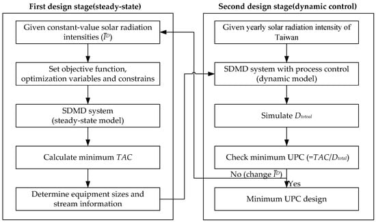 A two-stage optimization approach for the SDMD system is proposed. The first stage determines optimal equipment sizes and flow rates for each of the specified constant-value solar radiation intensities ( D) in the studied range. The objective is to minimize the total annual cost (TAC). The second stage is to determine the optimal design for the dynamic operation using the yearly solar radiation intensity of Taiwan. For each of the optimal solution determined from the first stage, the second optimization stage starts by the simulation of that design (equipment sizes) under dynamic operation with a control system proposed by this study. The UPCs (unit production costs) of the distillate water for all the designs from the first stage are then compared to determine the design with the minimum UPC. The two-stage procedure for optimal design of the SDMD system is depicted by the flow chart shown in Figure 4.