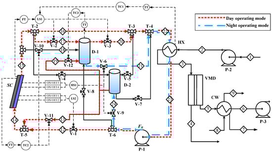 The thermal storage tank is used as a heat sink to collect solar energy by using a solar collector and to adjust the supply of the unpredictive solar energy. Water is used as the working fluid to transfer the solar energy from the solar collector to the thermal storage tank. The hot water from the thermal storage tank then provides the heat to the membrane distillation subsystem for desalination. In the day-time operation mode (red line in Figure 5), the hot water is supplied from the thermal storage tank (D-1) and the returning water from the heat exchanger (HX) (stream 23) is recycled back to the solar collector (SC) for absorbing the solar energy and stored in D-1. During the night-time operation (blue line in Figure 5), the hot water is also supplied from D-1 but the returning water is directly returned to D-2 to prevent the temperature decrease in D-1. The main control loops of the solar-driven VMD system include: