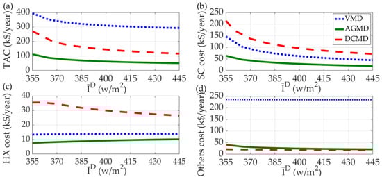 Optimal solutions of solar-driven AGMD, DCMD, and VMD systems for desalination from the first design stage for different constant-value solar radiation intensity, (a) TAC, (b) solar collector cost, (c) heat exchanger cost, (d) cost of all other units.