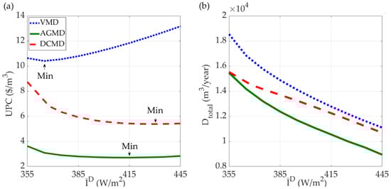 The results shown in Figure 7a indicate that the UPCs of the VMD system are the highest and the AGMD system gives the lowest UPCs. For each system, the design with the minimum UPC can be identified from the optimization analysis. The results in Figure 7b indicate that the water production rates of the three systems all decrease with the increase of D. The explanation is that the optimal size of solar collector is smaller when D is higher, which has been shown in Figure 6b. Consequently, less thermal energy can be stored during the daytime for night-time operation, which hence leads to a lower total production rate of water. The minimum UPC designs marked in Figure 7a are resulted from the trade-off of TAC and Dtotal, which are shown in Figure 6a and Figure 7b, respectively.
