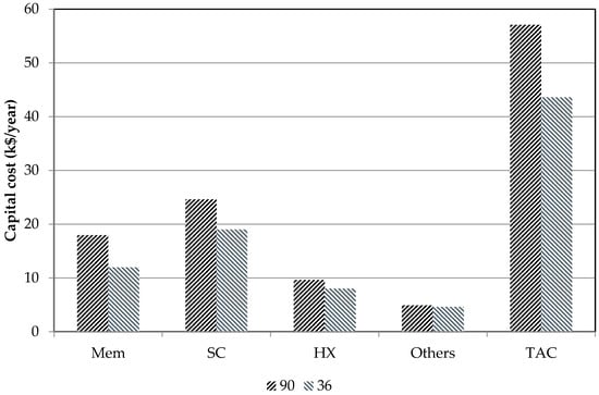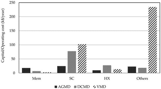 The main equipment of the SDMD systems for desalination are membrane distillation modules, heat exchanges, and solar collectors. The equipment costs of the optimal SDMD systems for desalination are compared in Figure 8. The comparison of the membrane distillation module costs indicates AGMD > DCMD > VMD and that of the solar collector costs indicates VMD > DCMD > AGMD. Regarding the cost of the heat exchanger, the DCMD system is the highest and the VMD system is the second highest. These results of the costs of membrane distillation module and solar collector can be explained by the features of the three types of membrane distillation modules. For AGMD, the air gap gives extra mass transfer resistance and results in larger membrane area. For DCMD, the fluids in contact with the membrane are both liquid phase. That causes greater energy loss via heat conduction and results in larger solar collector area and heat exchanger area. For VMD, the vacuum operation significantly enhances the mass flux across the membrane and results in the smallest membrane area but the largest solar collector area. The cause of the high heat exchanger cost of DCMD is the extra heat exchanger for the cold liquid circulation of the membrane distillation module and the high circulation rate of that stream. The large solar collector area of VMD requires high hot water circulation flow rate as well as high heat exchange area.