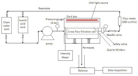 A laboratory bench scale cross-flow recirculation unit was used to study the permeation flux, anti-fouling, defouling, and UV-cleaning properties of the membranes. The schematic of the set-up is displayed in Figure 1, which consists of a membrane cross-flow filtration cell, two feed reservoirs (HA tank and clean water tank), a peristaltic pump (Hydra-Cell, Wanner International, U.K.), a flow meter, a balance connected with a data acquisition system to interpret the filtrate flow rate, a pressure gauge measuring the equilibrium pressure exerted on the filtration cell, a Philips UV-A light (Actinic BL TL-K 40 W/10-R) emitting near-UV radiation at long wave UV-A (350–400 nm), and an UV intensity meter (Sglux, sensor monitor 5.0). Within the crossflow filtration cell, each synthesized flat sheet membrane was cut and laid on top of the membrane holder in a custom-designed transparent rectangular membrane test cell with a size of 7.5 cm × 9.6 cm (effective membrane filtration area of 72.0 cm2, excluding the area covered by the O-ring) and was then tightened using a rubber O-ring.