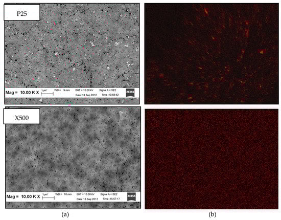 Top surface (a) field emission scanning electron microscopy (FESEM) micrographs and (b) energy dispersive X-ray (EDX) mapping of PVDF/TiO2 mixed-matrix membranes (MMMs) incorporated with different types of TiO2 (coagulation bath concentration = 0.01 g/L, pH = 4, ambient conditions).