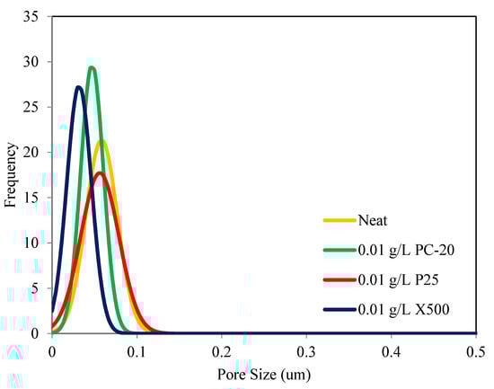 In-situ colloidal precipitation with a colloidal stable TiO2 suspension is an ideal method to synthesize PVDF/TiO2 MMMs with minimum changes to its physical properties. The pore size distributions of neat PVDF membranes and PVDF/TiO2 MMMs are shown in Figure 3. The mean pore diameter, dp,mean, of the neat PVDF membrane is approximately 0.059 μm, while for the membranes synthesized using PC-20, P25, and X500, TiO2 nanoparticles are measured at 0.047 µm, 0.058 µm, and 0.032 µm, respectively. Based on the distribution patterns across different membrane samples, it can be seen that the embedment of TiO2 nanoparticles had a more prominent effect on pore size alteration than pore size distribution. In other words, smaller TiO2 nanoparticle size impacted to a greater degree on membrane pore size shift. The distribution patterns also showed that embedment of PC-20 and P25 TiO2 nanoparticles did not cause significant change in membrane pore size, unlike the case for X500 displaying a pore-narrowing tendency when introduced into the membrane’s polymeric matrix. This is likely due to pore blocking when the TiO2 nanoparticles used are relatively smaller than the membrane pores and disagreed with the finding obtained by Wang et al. [37]. PVDF-PVP-TiO2 membrane synthesized by Wang et al. (2016) had a larger pore size with the addition of P25 TiO2 NPs [37]. Regardless, the pore size narrowing seen in X500 membrane samples is considered not significant. Overall, the results indicated that in-situ colloidal precipitation with a hydrophilic filler such as TiO2, in a stable colloidal suspension, is an ideal method to synthesize PVDF/TiO2 MMMs with minimum changes to their physical properties compared to PVDF TiO2 membranes synthesized by other researchers [38].